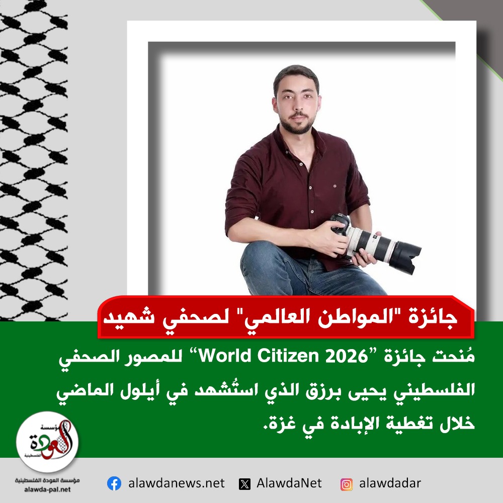 وقد مُنحت جائزة “World Citizen 2026” للمصور الصحفي الفلسطيني يحيى برزق الذي استُشهد في 21 أيلول/ سبتمبر 2025 خلال تغطية الإبادة في غزة.