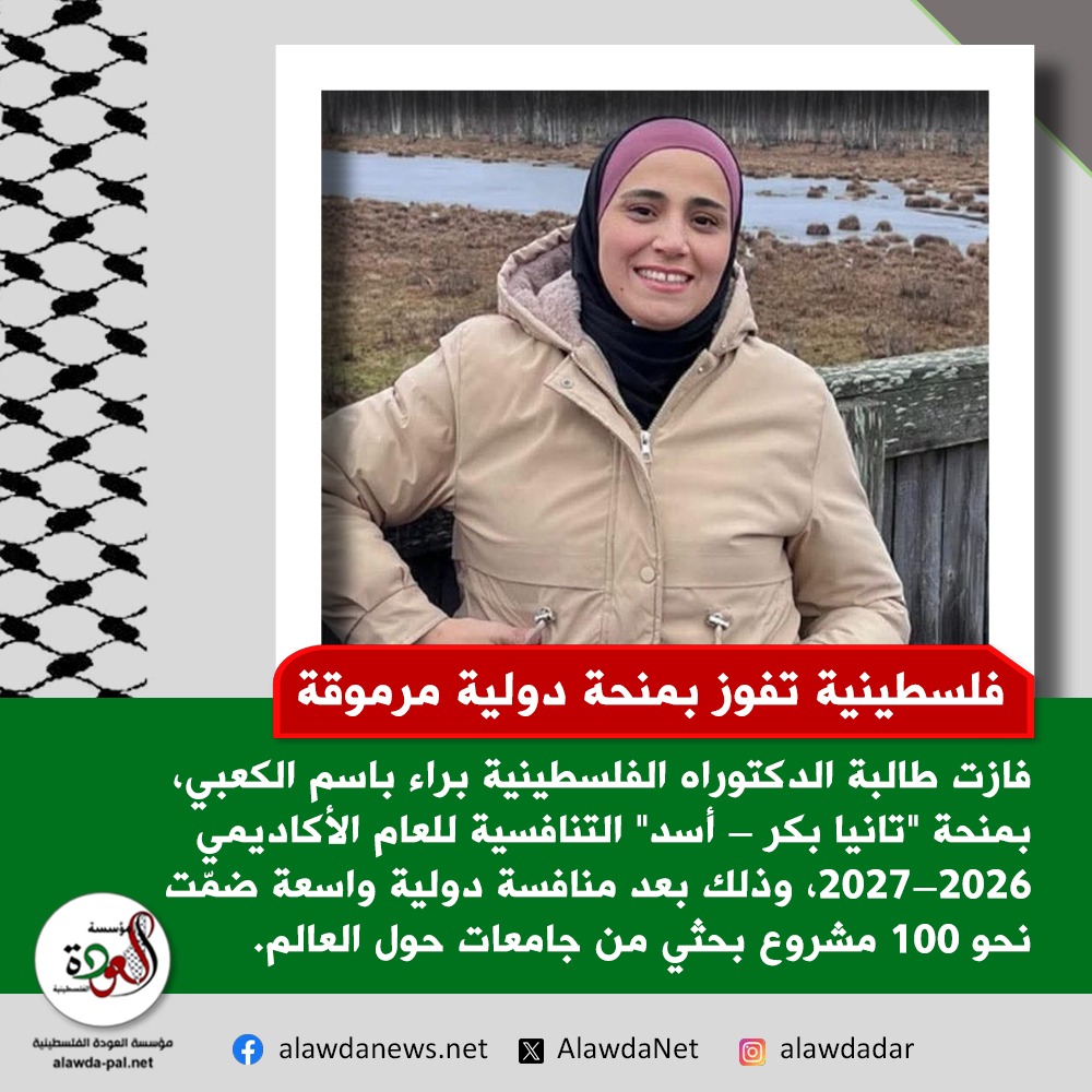 فازت طالبة الدكتوراه الفلسطينية في برنامج التطوير التربوي بجامعة بيرزيت، براء باسم الكعبي، بمنحة "تانيا بكر – أسد" التنافسية للعام الأكاديمي 2026–2027، وذلك بعد منافسة دولية واسعة ضمّت نحو 100 مشروع بحثي من جامعات حول العالم.