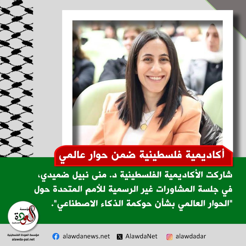 شاركت الأكاديمية الفلسطينية د. منى نبيل ضميدي، في جلسة المشاورات غير الرسمية للأمم المتحدة حول "الحوار العالمي بشأن حوكمة الذكاء الاصطناعي"، بدعوة رسمية لتكون ضمن قائمة النخبة الافتتاحية.