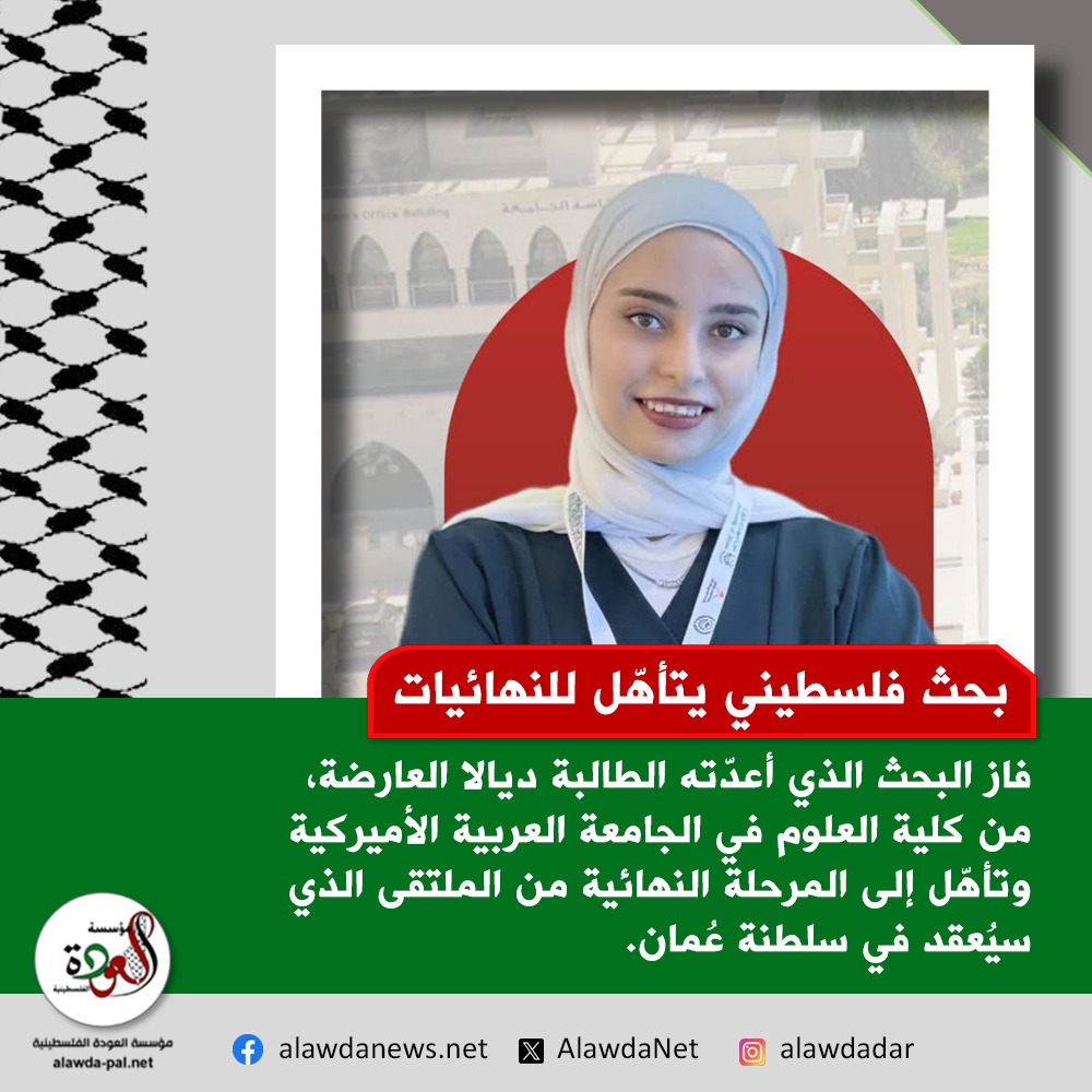 فبعد أن فاز البحث الذي أعدّته الطالبة ديالا العارضة، من كلية العلوم في الجامعة العربية الأميركية، على مستوى الوطن العربي في المرحلة الأولى من التقييم، تأهّل إلى المرحلة النهائية من الملتقى الذي سيُعقد في سلطنة عُمان.
